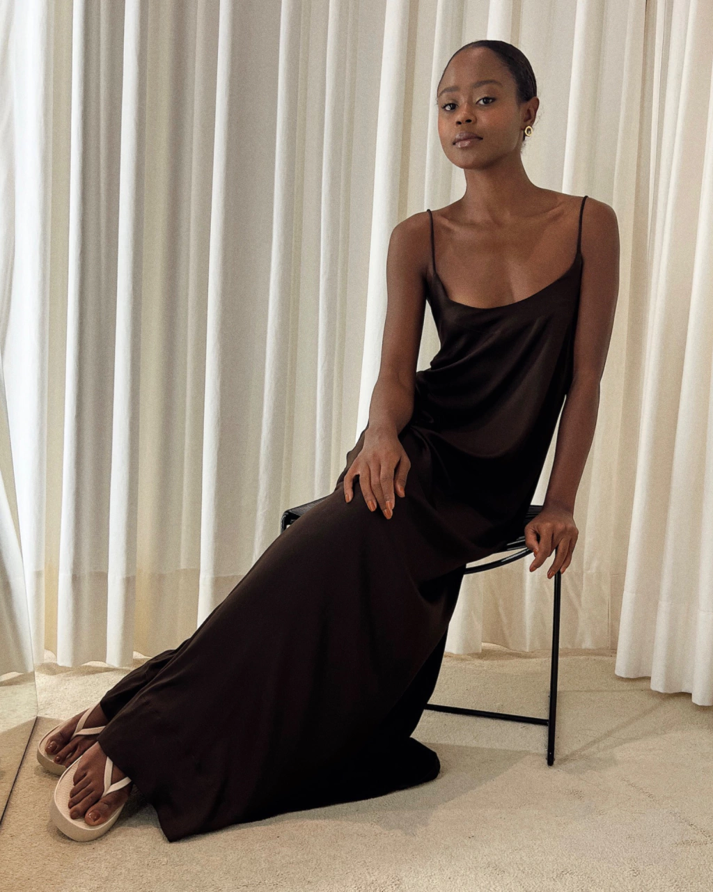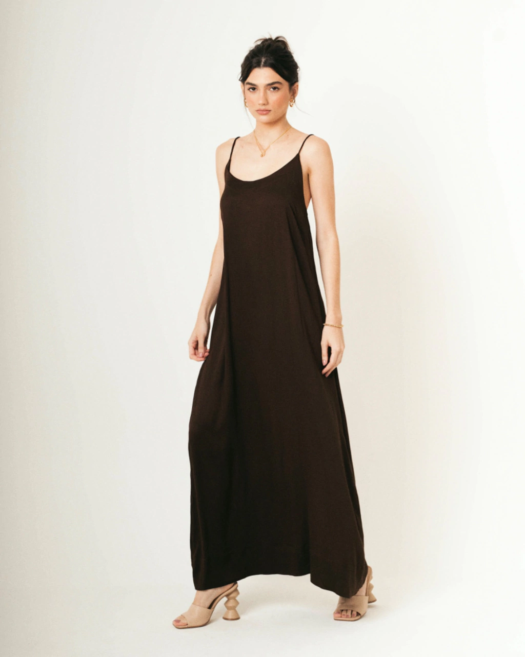 Vestido longo com alças finas e reguláveis por amarração nas costas, tecido flúido e confortável (97% viscose 3% elastano), comprimento longo e decote posterior.