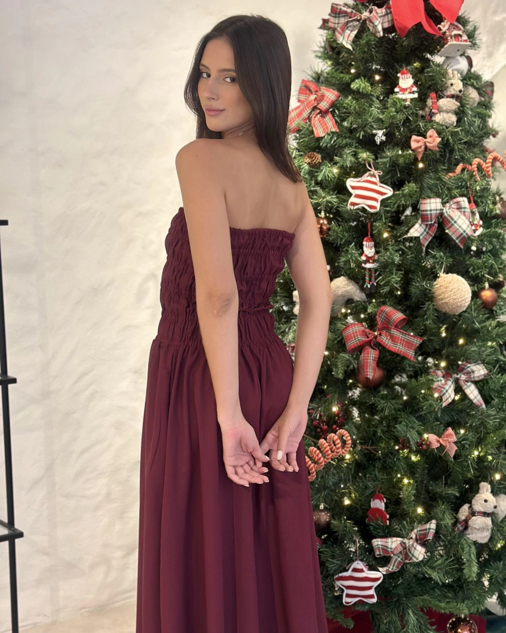Vestido sem alça, comprimento midi, confeccionado em tecido plano (70% viscose, 27% linho, 3% elastano) todo franzido com lastex. Possui dois bolsos faca.