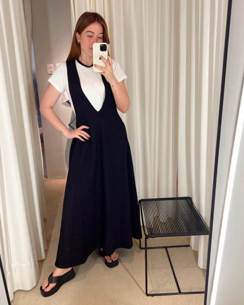 Vestido com shape evasê, decote frontal em V profundo, fechamento em zíper invisível posterior e detalhe de recorte adicionando volume e movimento nas laterais da saia, Perfeito para ser usado como salopete com croppeds e blusas.