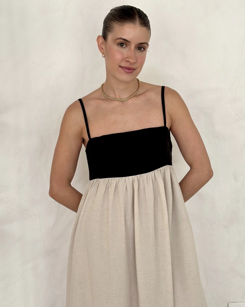 Vestido longo em tecido encorpado (92% viscose 8% poliester) decote reto em preto, alças finas com amarração posterior possibilitando o ajuste das alças nos ombros, fechamento lateral no busto em zíper invisível.