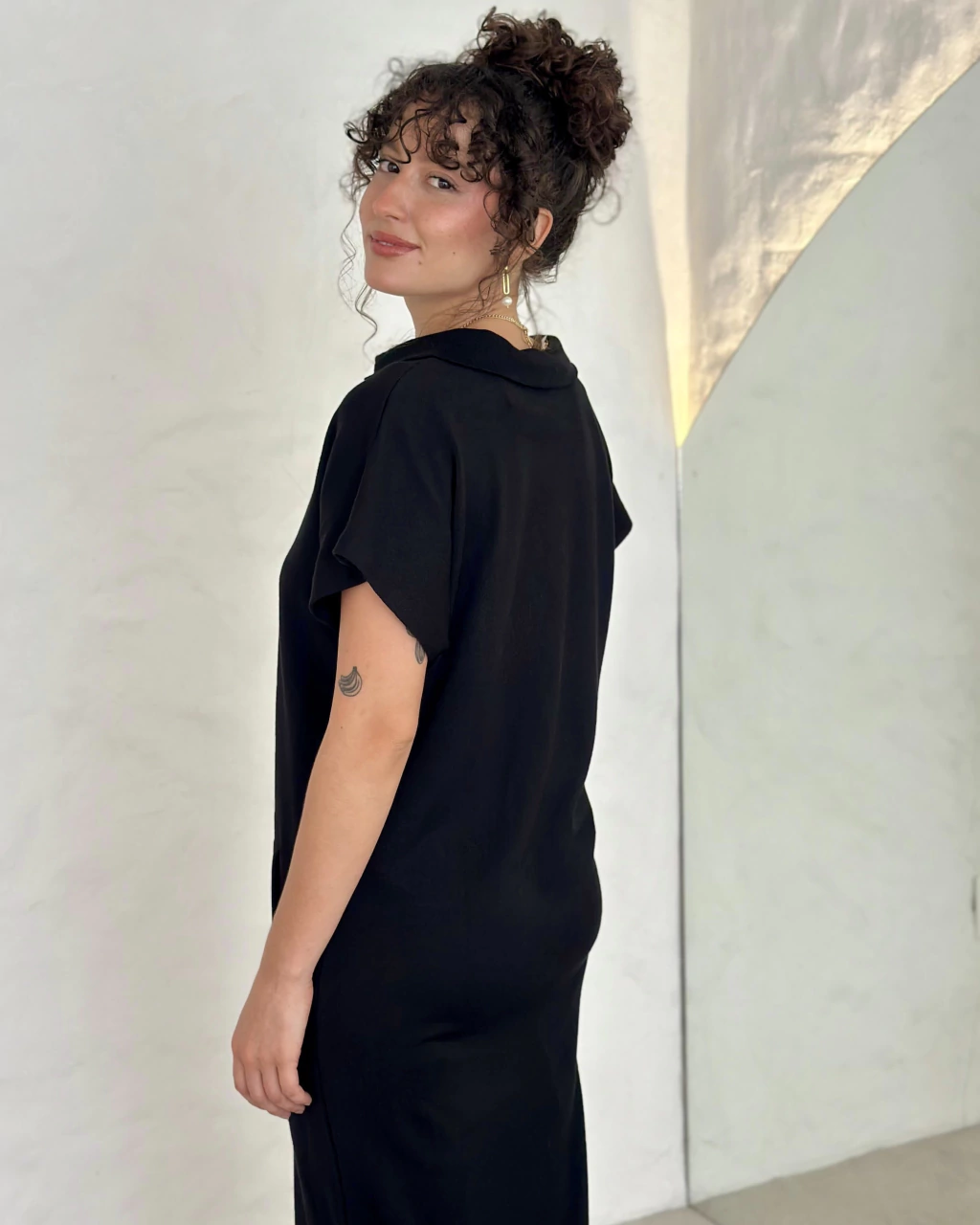 Vestido confeccionado em tricot de alta qualidade. Possui shape reto ao corpo, gola estilo polo, dois bolsos na altura do quadril e fendas laterais.