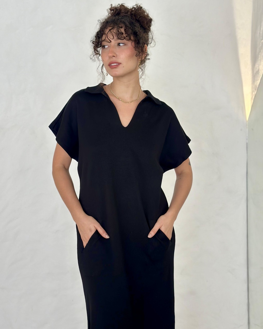 Vestido confeccionado em tricot de alta qualidade. Possui shape reto ao corpo, gola estilo polo, dois bolsos na altura do quadril e fendas laterais.