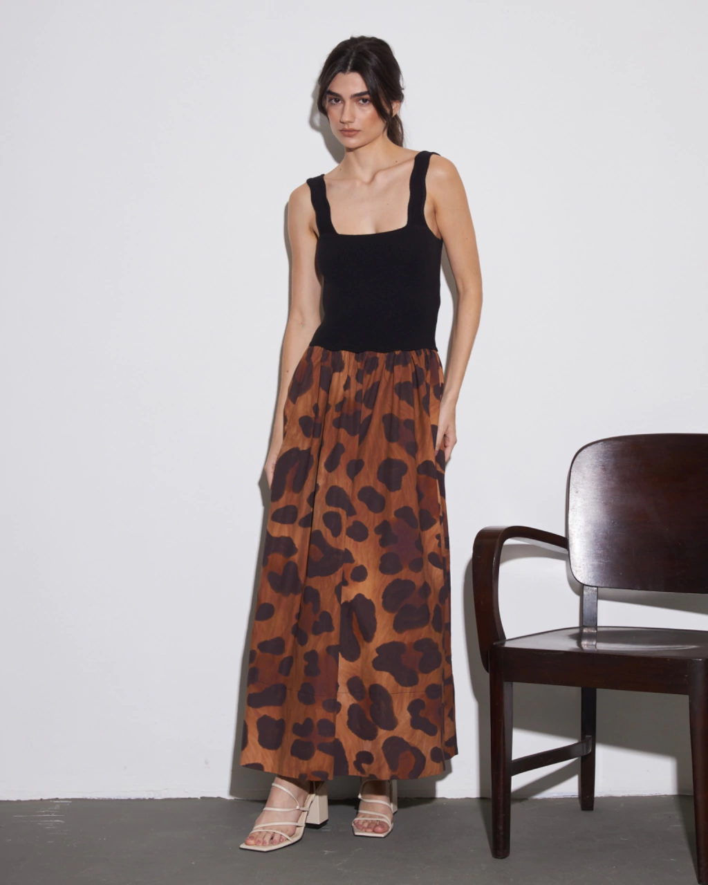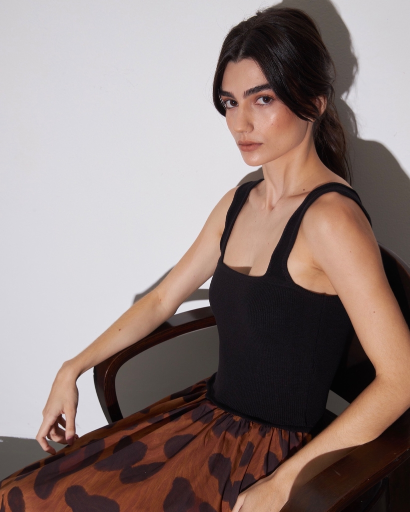 Vestido longo bicolor com parte superior em tricot preto(96% acrílico e 4% elastano) e inferior em tricoline preta (100% algodão). Decote reto e com alças largas. Modelagem confortável, moderna e feminina,
