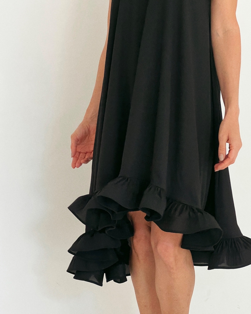 Vestido confeccionado em tecido flúido (100% poliéster), decote nadador e barra assimétrica estruturada com crinol.