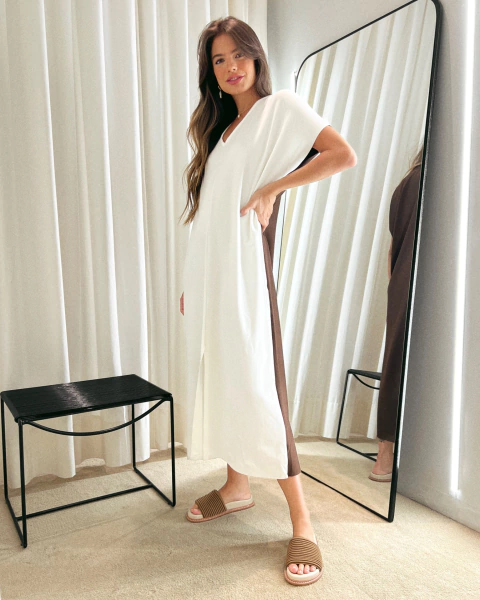 Vestido longo bicolor com shape reto e amplo, decote V, mangas curtas e fenda frontal. Tecido malha encorpado (94% viscose e 6% elastano).