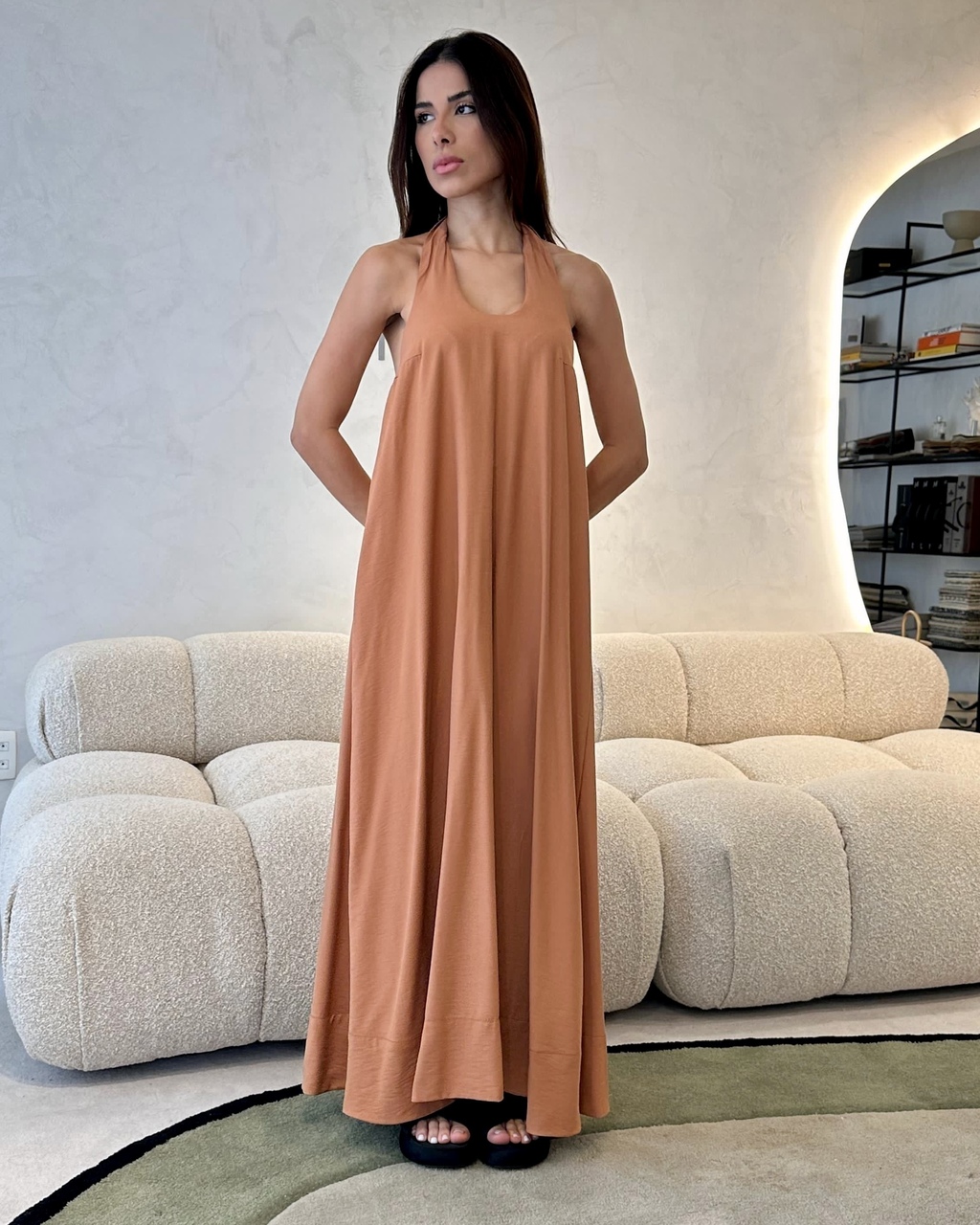 Vestido confeccionado em tecido plano (85% viscose 15% poliéster), comprimento longo, decote de costas nuas com fechamento em zíper invisível na lateral.