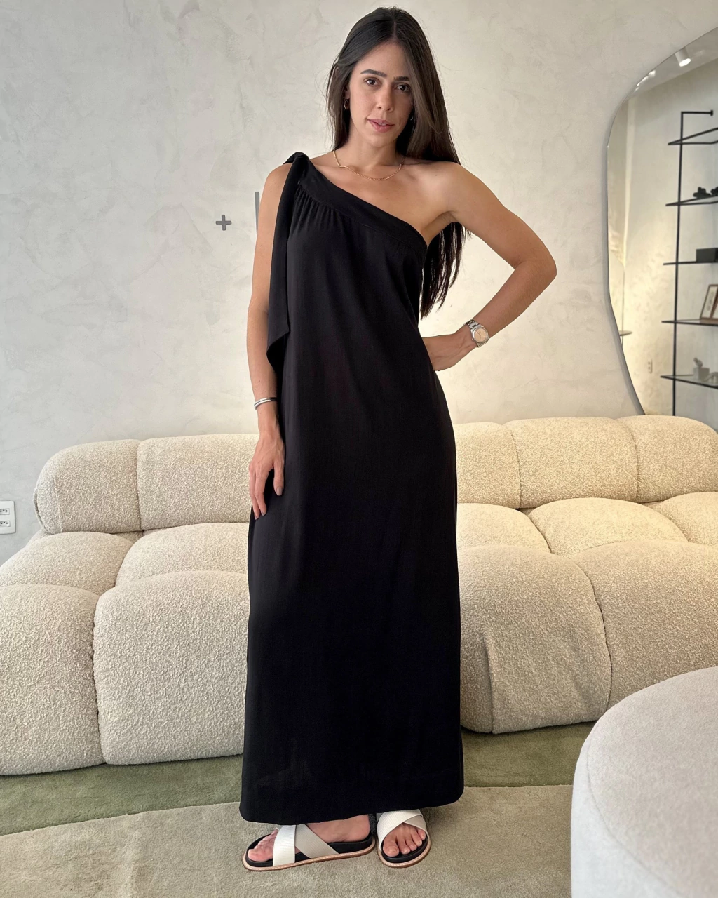 Vestido longo, confeccionado em tecido de viscose, shape amplo e alça única com amarração na área do ombro.